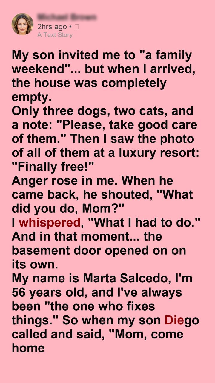 My son invited me to “a family weekend”… but when I arrived, the house was completely empty. Only three dogs, two cats, and a note: “Please, take good care of them.” Then I saw the photo of all of them at a luxury resort: “Finally free!” Anger rose in me. When he came back, he shouted, “What did you do, Mom?” I whispered, “What I had to do.” And in that moment… the basement door opened on its own.