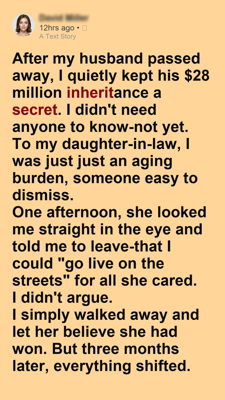After my husband passed away, I quietly kept his $28 million inheritance a secret. I didn’t need anyone to know—not yet. To my daughter-in-law, I was just an aging burden, someone easy to dismiss. One afternoon, she looked me straight in the eye and told me to leave—that I could “go live on the streets” for all she cared. I didn’t argue. I simply walked away and let her believe she had won. But three months later, everything shifted. When an eviction notice arrived at her door, she finally realized just how wrong she had been—and how much she had underestimated me.