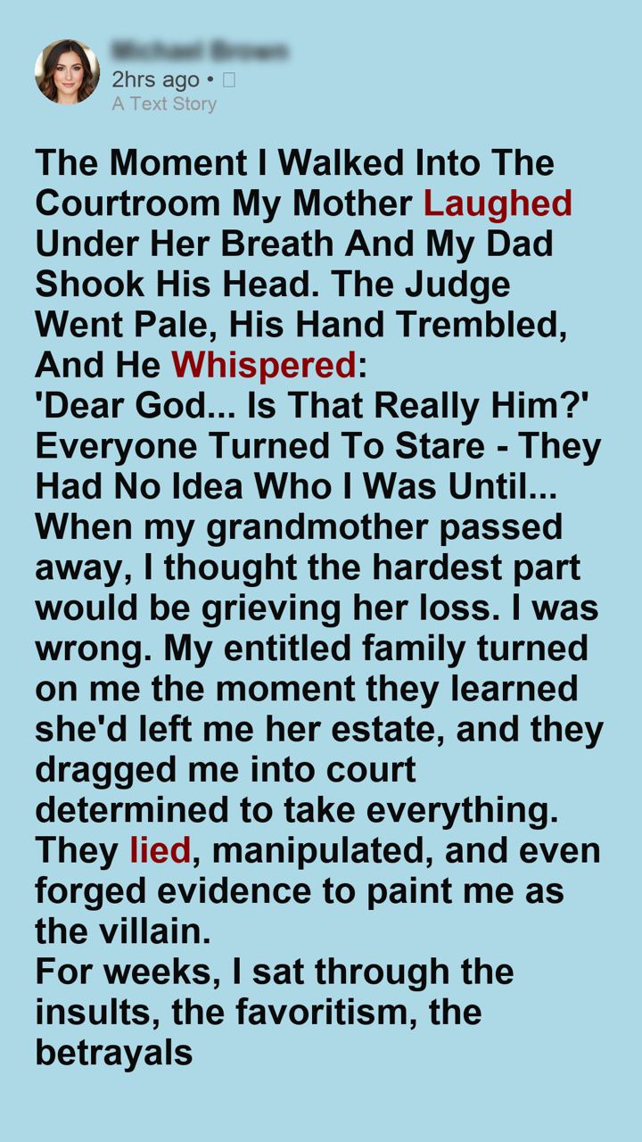 When I walked through the double oak doors, my mother didn’t even look up. She just let out a sharp, mocking laugh under her breath. “Look at him,” she whispered loud enough for the court reporter to hear. “He probably had to pawn his suit just to afford the bus ride here.”