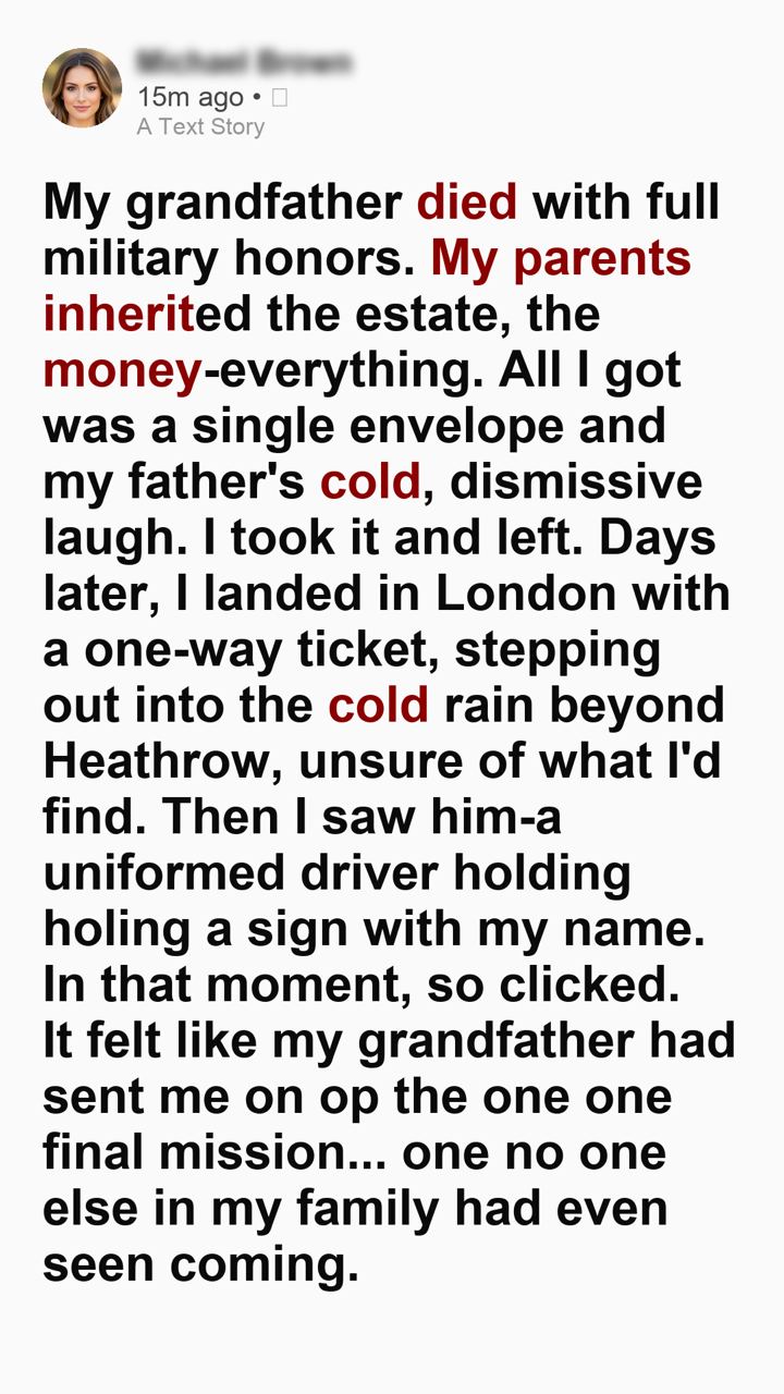 My grandfather died with full military honors. My parents inherited the estate, the money—everything. All I got was a single envelope and my father’s cold, dismissive laugh. I didn’t argue. I took it and left. Days later, I landed in London with a one-way ticket, stepping out into the cold rain beyond Heathrow, unsure of what I’d find. Then I saw him—a uniformed driver holding a sign with my name. In that moment, something clicked. It felt like my grandfather had sent me on one final mission… one no one else in my family had even seen coming. The sleek, black town car idling behind the stoic driver looked completely out of place for a young woman who had just been aggressively written out of a massive, multi-million dollar family inheritance.