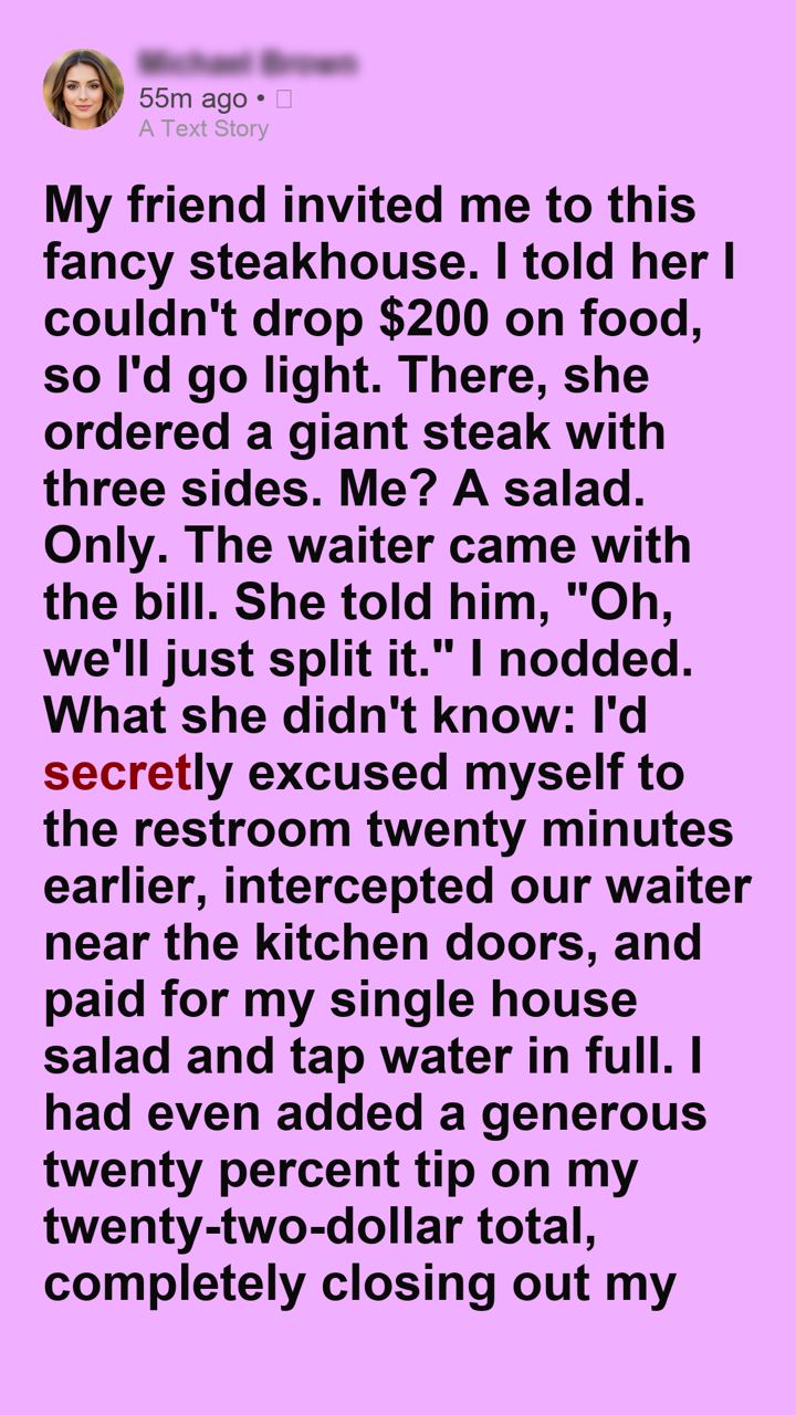 My friend invited me to this fancy steakhouse. I told her I couldn’t drop $200 on food, so I’d go light. There, she ordered a giant steak with three sides. Me? A salad. Only. The waiter came with the bill. She told him, “Oh, we’ll just split it.” I nodded. What she didn’t know: I’d secretly excused myself to the restroom twenty minutes earlier, intercepted our waiter near the kitchen doors, and paid for my single house salad and tap water in full. I had even added a generous twenty percent tip on my twenty-two-dollar total, completely closing out my portion of the evening’s festivities in crisp cash. The black, leather-bound checkbook currently resting on the pristine white tablecloth didn’t contain our combined total. It contained hers, and hers alone. To fully appreciate the absolute poetry of this moment, we have to rewind. My friend—let’s call her Vanessa—has a well-documented, meticulously calculated history of financial amnesia when it comes to group dining. For years, I had watched her employ a specific kind of restaurant mathematics that somehow always heavily favored her own wallet. If a group of us went out for a casual Mexican dinner, she was invariably the one ordering three top-shelf margaritas, the premium tableside guacamole, and the steak fajitas, only to enthusiastically suggest we split the check evenly down the middle when the time came. For a long time, I went along with it. We all did. It was easier to absorb the extra twenty or thirty dollars than to be the one difficult person at the table pulling out a calculator, demanding itemized receipts, and completely killing the vibe of the evening.