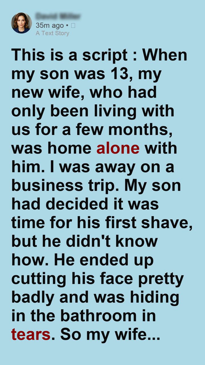When my son was 13, my new wife, who is not his biological mother, had only been living with us for a few months. I was away on a business trip, leaving the two of them home together for the weekend. My son had been getting teased at school about his patchy upper lip, so he secretly decided it was time for his first shave. But without anyone to show him how, things quickly went wrong.