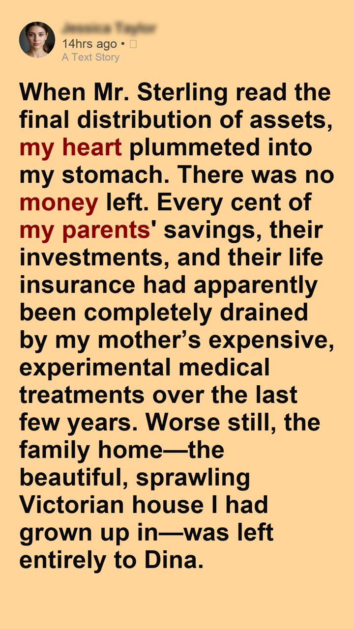 When Mr. Sterling read the final distribution of assets, my heart plummeted into my stomach. There was no money left. Every cent of my parents’ savings, their investments, and their life insurance had apparently been completely drained by my mother’s expensive, experimental medical treatments over the last few years. Worse still, the family home—the beautiful, sprawling Victorian house I had grown up in—was left entirely to Dina.