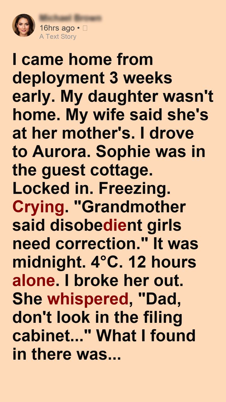 I froze. I looked past her to a battered metal cabinet in the corner of the shed. Whatever was in there, Evelyn had terrified my daughter into keeping it a secret. I set Sophie gently in the heated cab of my truck, locked the doors, and walked back into the freezing shed.