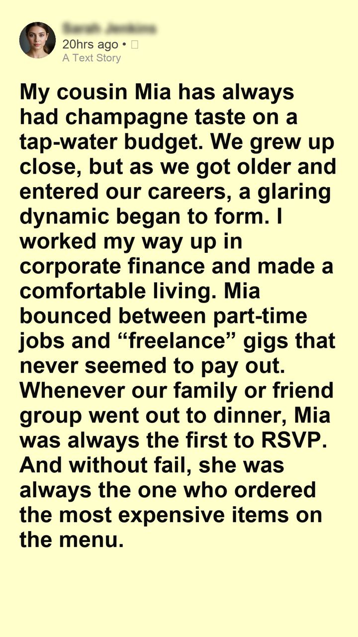 My cousin Mia has always had champagne taste on a tap-water budget. We grew up close, but as we got older and entered our careers, a glaring dynamic began to form. I worked my way up in corporate finance and made a comfortable living. Mia bounced between part-time jobs and “freelance” gigs that never seemed to pay out.