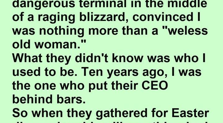 “Your daughter destroyed my $5,000 rug with her blood,” my son-in-law’s mother sneered, as if that justified everything that followed. They left her alone at a dangerous terminal in the middle of a raging blizzard, convinced I was nothing more than a “useless old woman.” What they didn’t know was who I used to be. Ten years ago, I was the one who put their CEO behind bars. So when they gathered for Easter dinner, laughing like nothing had happened, the lights suddenly went out. The room fell silent. Then I stepped inside, wearing my old badge. “Dinner’s over,” I said calmly. “You’re heading somewhere that doesn’t serve turkey.”