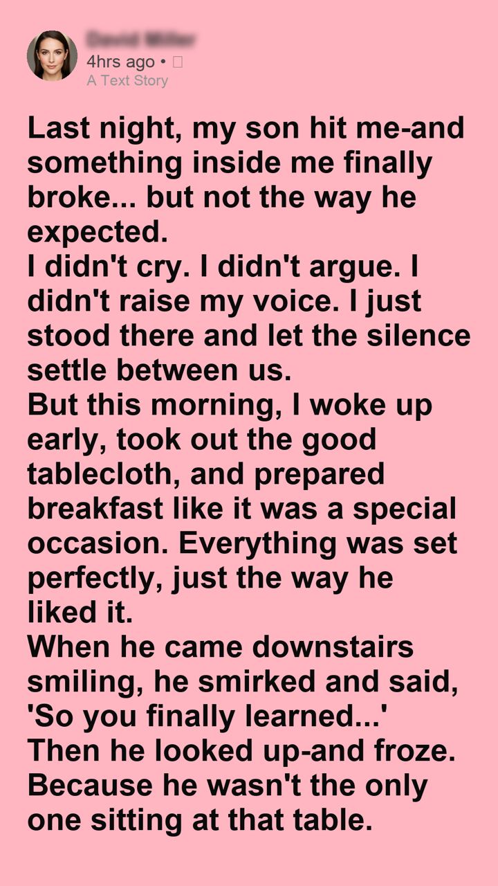 Last night, my son hit me, and something inside me finally broke, but not in the way he expected. I didn’t cry. I didn’t argue. I didn’t raise my voice. I just stood there, feeling the sting on my cheek and the heavier sting in my chest, and let the silence settle between us. He walked away like nothing had happened. Like it was normal. Like I deserved it.