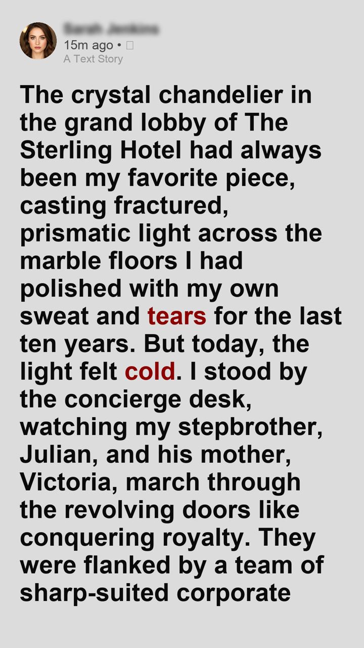 The crystal chandelier in the grand lobby of The Sterling Hotel had always been my favorite piece, casting fractured, prismatic light across the marble floors I had polished with my own sweat and tears for the last ten years. But today, the light felt cold. I stood by the concierge desk, watching my stepbrother, Julian, and his mother, Victoria, march through the revolving doors like conquering royalty. They were flanked by a team of sharp-suited corporate liquidators, here to tear apart the legacy my late father and I had built, piece by agonizing piece.