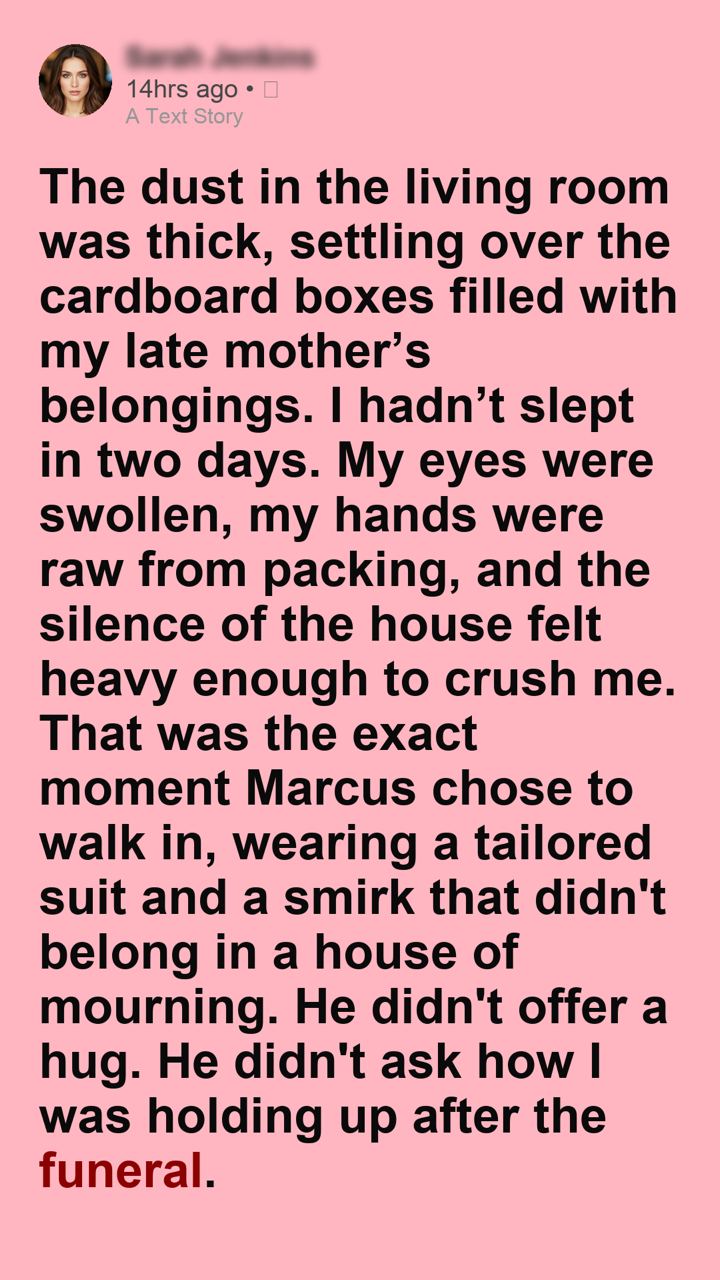The dust in the living room was thick, settling over the cardboard boxes filled with my late mother’s belongings. I hadn’t slept in two days. My eyes were swollen, my hands were raw from packing, and the silence of the house felt heavy enough to crush me.
