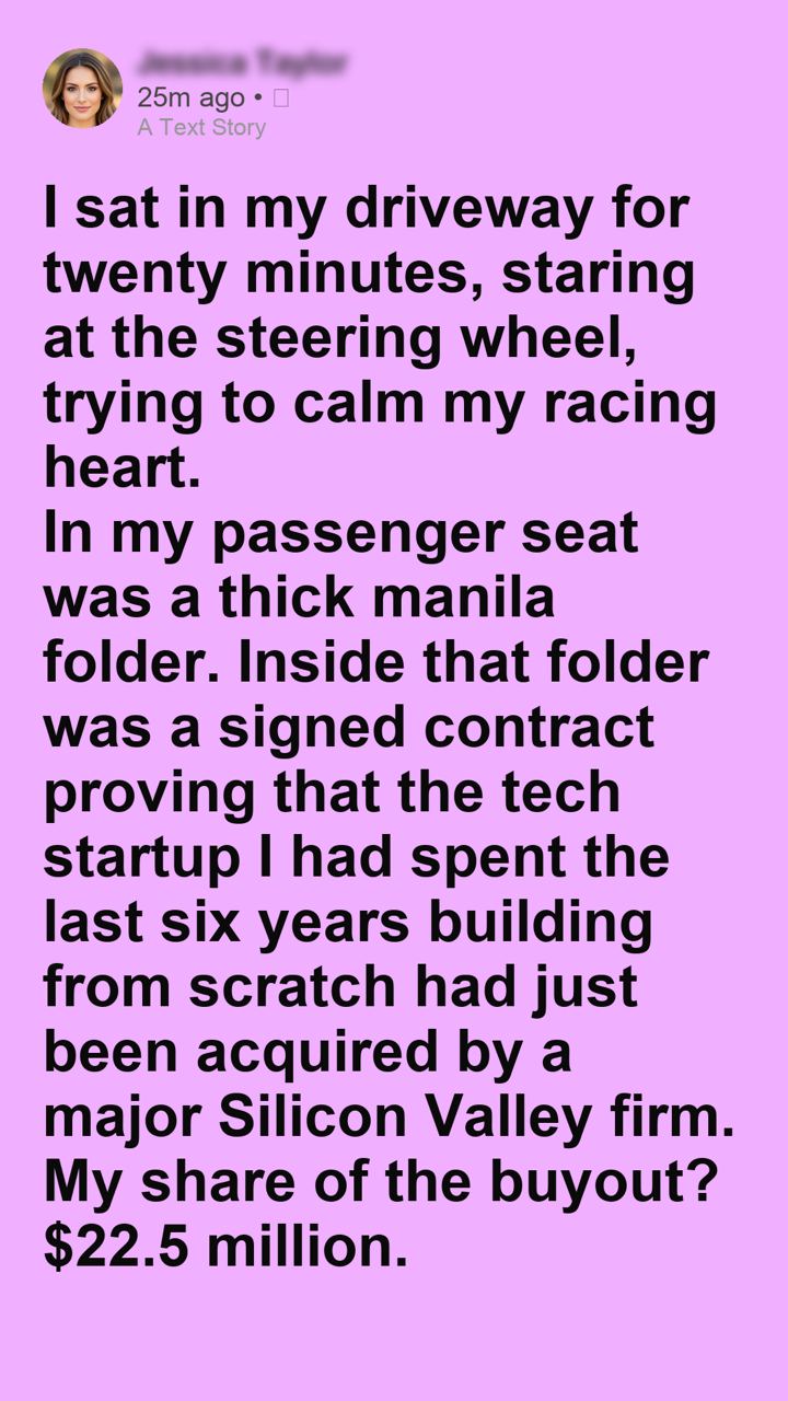 In my passenger seat was a thick manila folder. Inside that folder was a signed contract proving that the tech startup I had spent the last six years building from scratch had just been acquired by a major Silicon Valley firm.