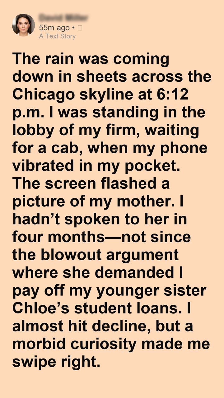 The screen flashed a picture of my mother. I hadn’t spoken to her in four months—not since the blowout argument where she demanded I pay off my younger sister Chloe’s student loans. I almost hit decline, but a morbid curiosity made me swipe right.