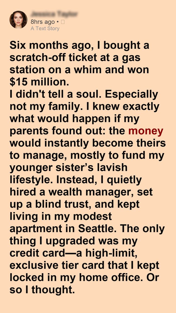 I didn’t tell a soul. Especially not my family. I knew exactly what would happen if my parents found out: the money would instantly become theirs to manage, mostly to fund my younger sister’s lavish lifestyle. Instead, I quietly hired a wealth manager, set up a blind trust, and kept living in my modest apartment in Seattle. The only thing I upgraded was my credit card—a high-limit, exclusive tier card that I kept locked in my home office. Or so I thought.