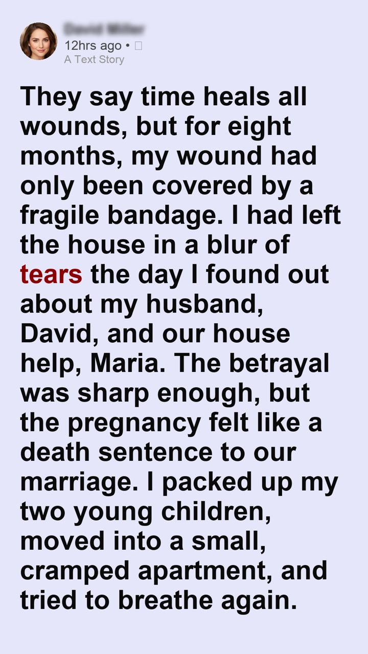 They say time heals all wounds, but for eight months, my wound had only been covered by a fragile bandage. I had left the house in a blur of tears the day I found out about my husband, David, and our house help, Maria. The betrayal was sharp enough, but the pregnancy felt like a death sentence to our marriage. I packed up my two young children, moved into a small, cramped apartment, and tried to breathe again.