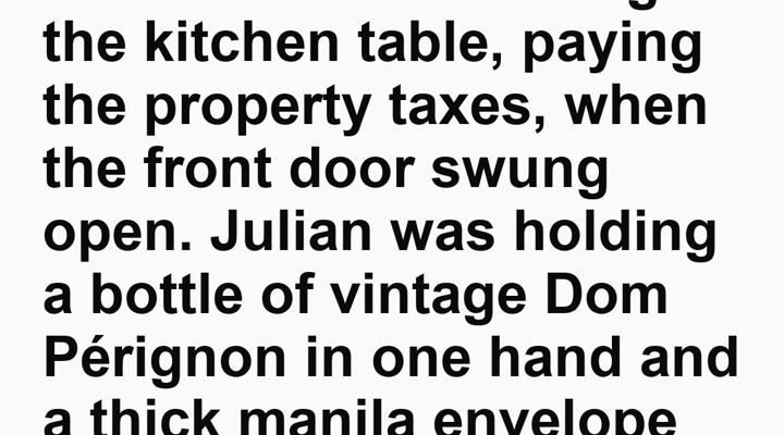 It was a Tuesday afternoon. I was sitting at the kitchen table, paying the property taxes, when the front door swung open. Julian was holding a bottle of vintage Dom Pérignon in one hand and a thick manila envelope in the other. He wasn’t wearing his usual tech-bro fleece; he was wearing a bespoke suit he had secretly bought the week before.
