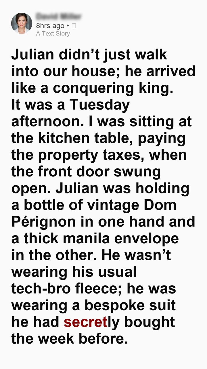 It was a Tuesday afternoon. I was sitting at the kitchen table, paying the property taxes, when the front door swung open. Julian was holding a bottle of vintage Dom Pérignon in one hand and a thick manila envelope in the other. He wasn’t wearing his usual tech-bro fleece; he was wearing a bespoke suit he had secretly bought the week before.