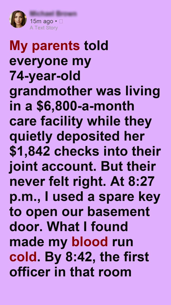 When people hear what happened now, they always focus on the time stamps. 8:27 p.m. door opens. 8:42 p.m. officer in the room. They tell the story like a thriller because precision makes horror feel containable. But the real story wasn’t fifteen minutes. It was the six months before that—months of invented invoices, redirected checks, fabricated facility talk, controlled access, and a basement being slowly converted into a place where an old woman could be hidden without being technically dead. The coldness of it lives not just in the discovery, but in the maintenance. In my mother buying groceries and folding towels upstairs while her own mother sat downstairs with a bell. In my father cashing entitlement into policy language and calling confinement “temporary.” In the way both of them looked more inconvenienced than ashamed when the police finally arrived.