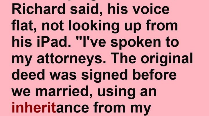 “I’m keeping the house,” Richard said, his voice flat, not looking up from his iPad. “I’ve spoken to my attorneys. The original deed was signed before we married, using an inheritance from my father. It’s pre-marital property. They’ve drafted a settlement that gives you a modest stipend and a condo downtown. You need to sign it today.”