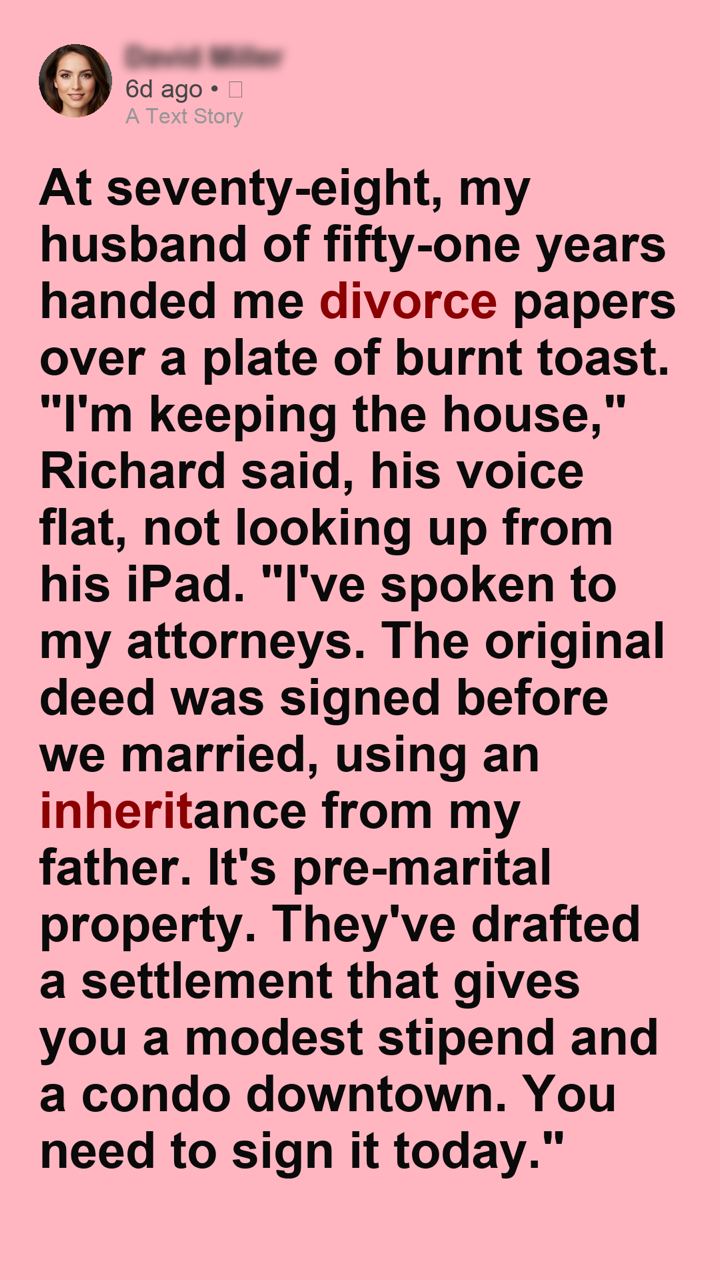 At seventy-eight, my husband of fifty-one years handed me divorce papers over a plate of burnt toast.