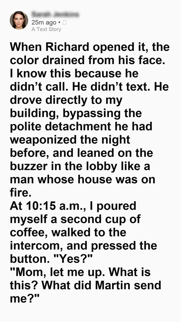 “Mom, let me up. What is this? What did Martin send me?” Richard’s voice was entirely stripped of the polished, country-club veneer he had worn at the podium. He sounded breathless. Panicked.
