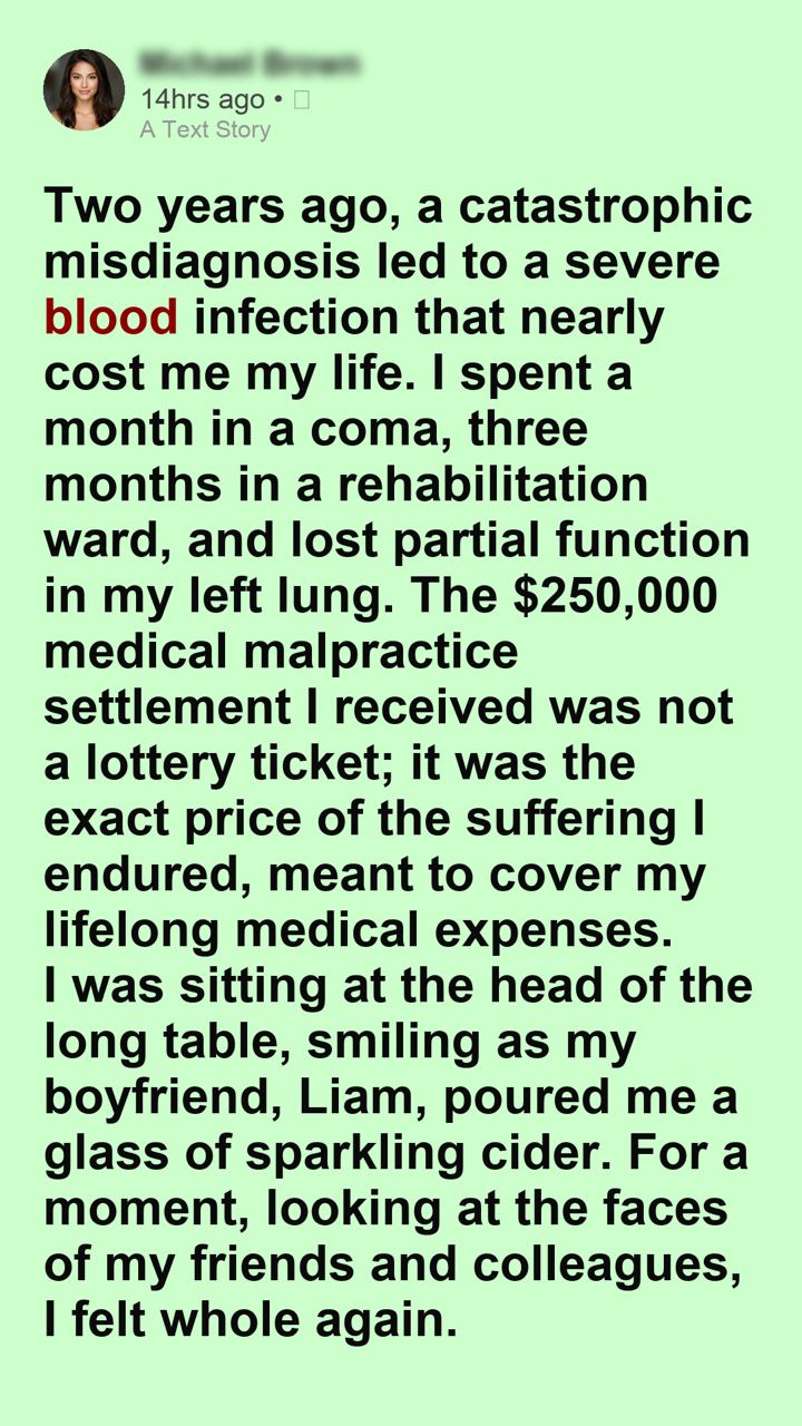 I was sitting at the head of the long table, smiling as my boyfriend, Liam, poured me a glass of sparkling cider. For a moment, looking at the faces of my friends and colleagues, I felt whole again.