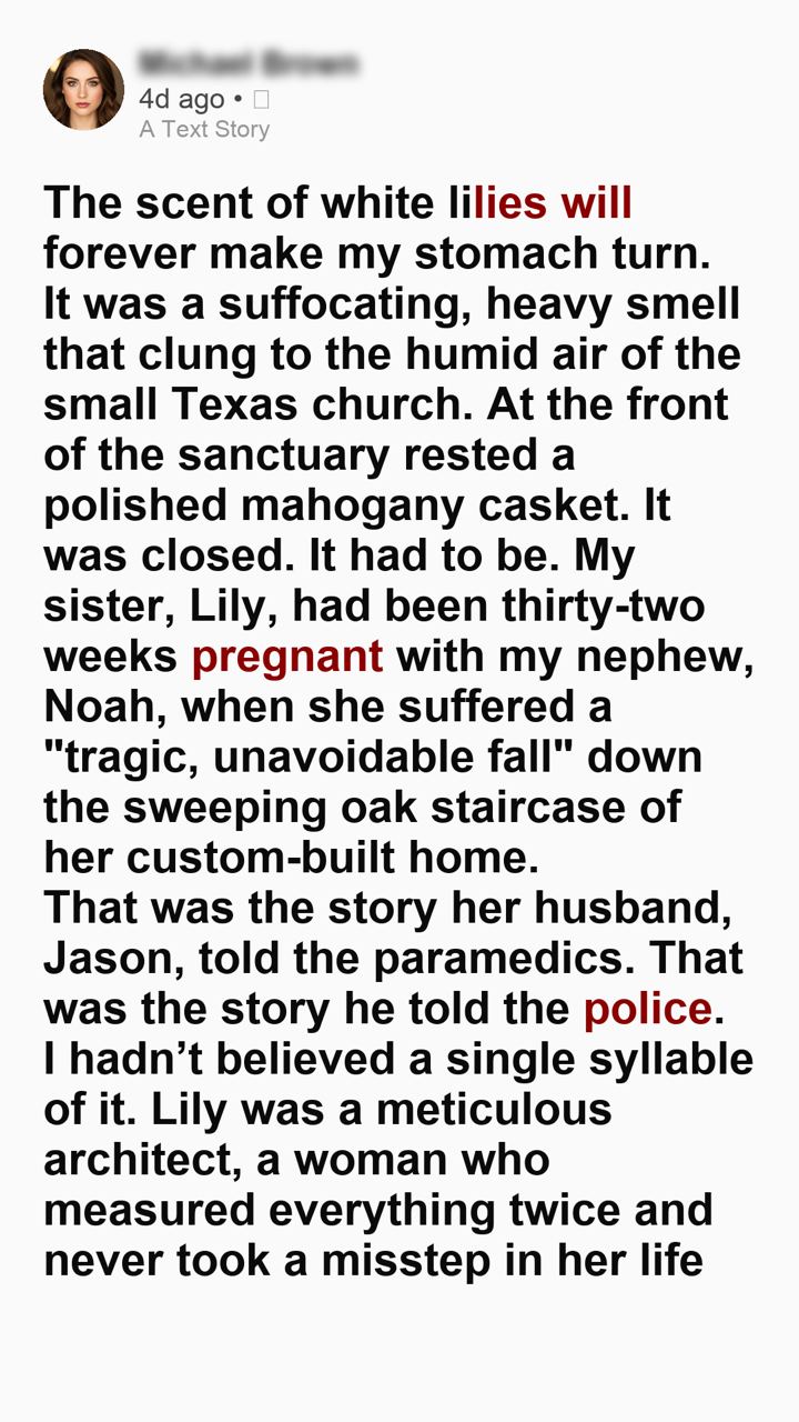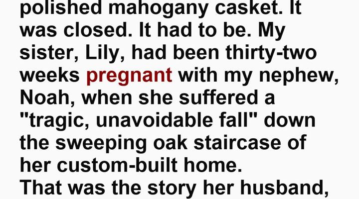 It was a suffocating, heavy smell that clung to the humid air of the small Texas church. At the front of the sanctuary rested a polished mahogany casket. It was closed. It had to be. My sister, Lily, had been thirty-two weeks pregnant with my nephew, Noah, when she suffered a “tragic, unavoidable fall” down the sweeping oak staircase of her custom-built home.