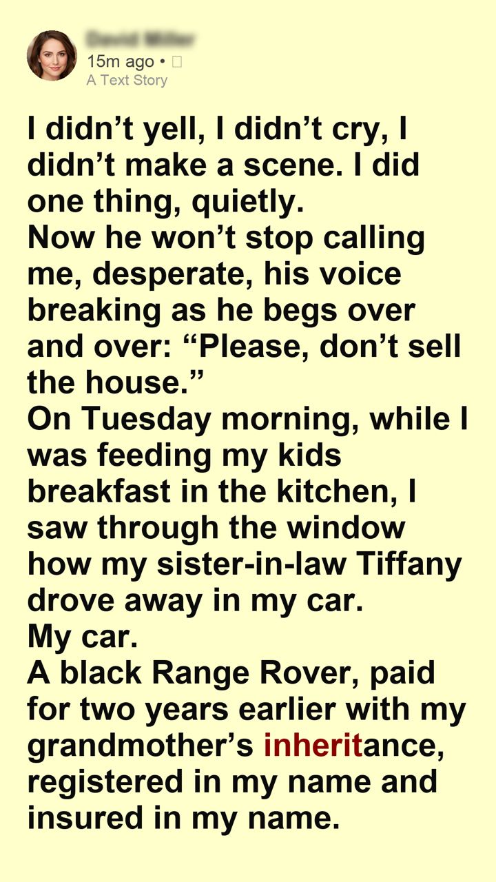 On Tuesday morning, while I was feeding my kids breakfast in the kitchen, I saw through the window how my sister-in-law Tiffany drove away in my car.